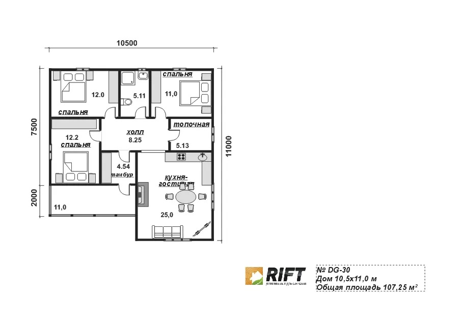 Дом из бруса DG30 — уютный проект площадью 107 м² (10,5×11 м), выполненный из качественного бруса. Идеален для загородного проживания. Срок строительства — 45 дней. Также можно заказать утепление стен и крыши, а при необходимости провести инженерные сети, включая отопление, водоснабжение и электричество. Строительство такого дома занимает около 45 дней, а его эксплуатация практически не требует дополнительных затрат благодаря энергоэффективности материалов. Доступна установка свайно-винтового фундамента, что позволяет сократить время строительства и уменьшить расходы.