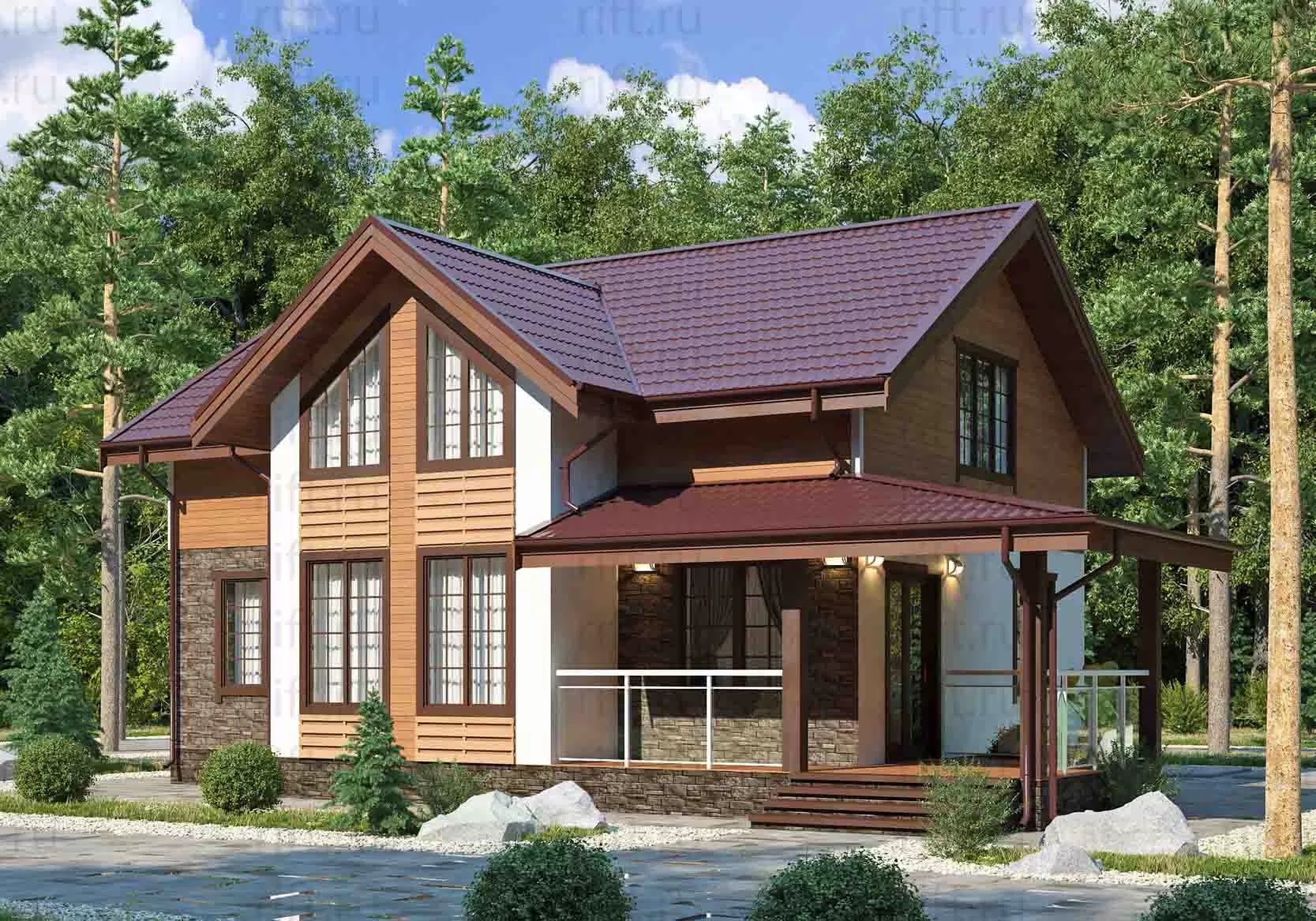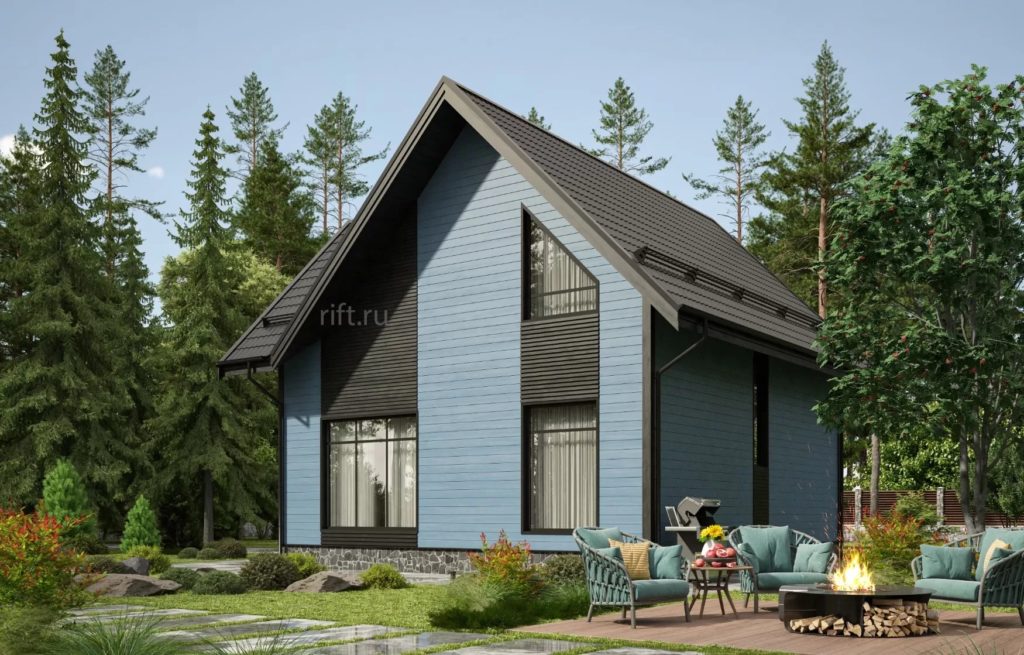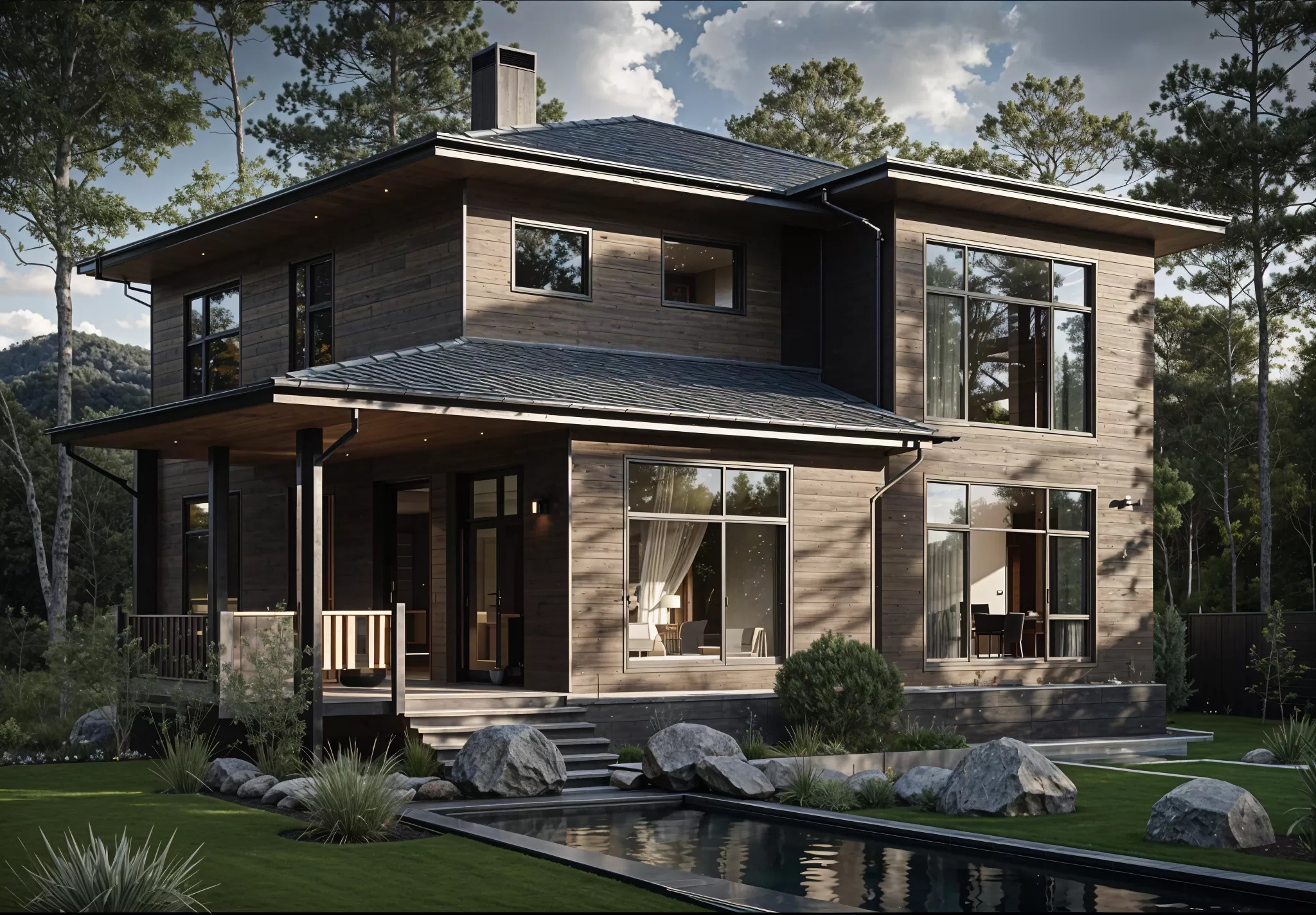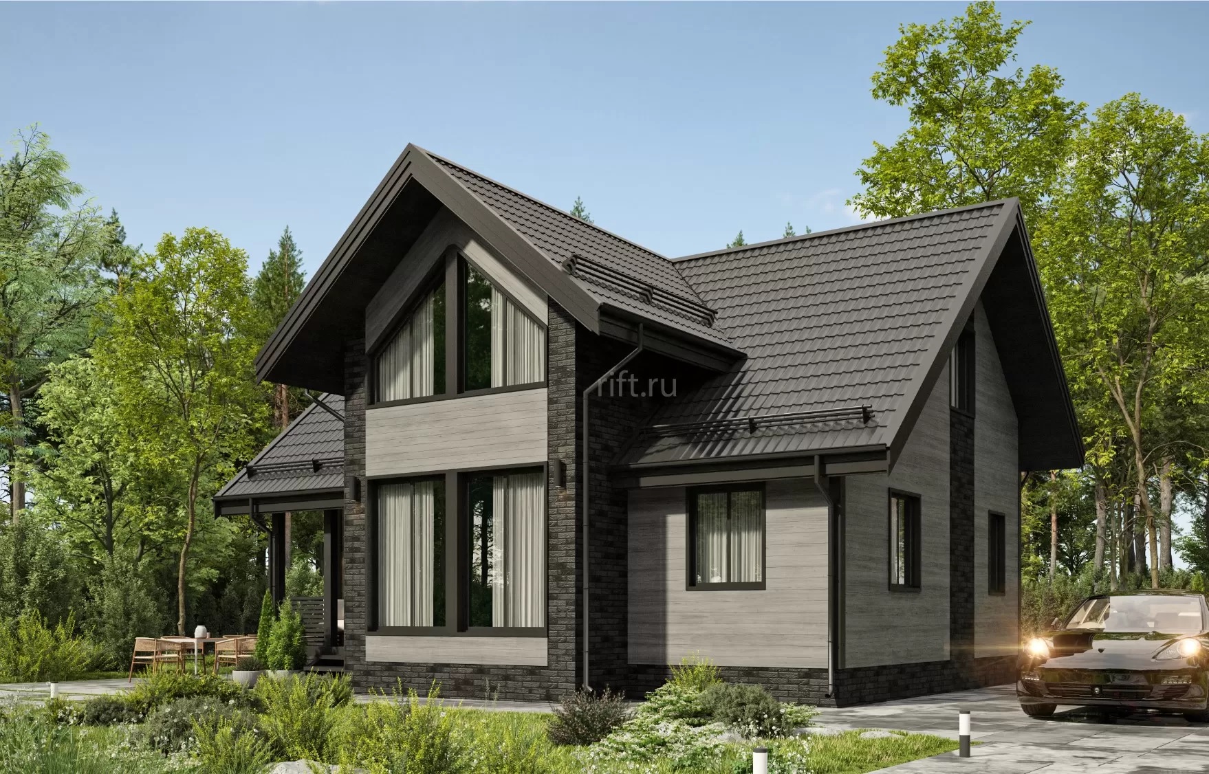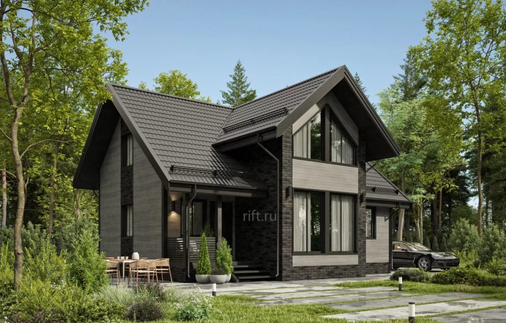Для отделки используется натуральное дерево в сочетании с современными материалами. Фасад дома облицован сайдингом, имитирующим структуру дерева, что придает ему элегантный и стильный вид. Внутренняя отделка выполнена в скандинавском стиле с использованием светлых оттенков и натуральных материалов.