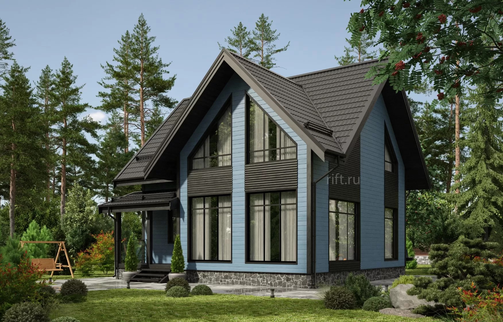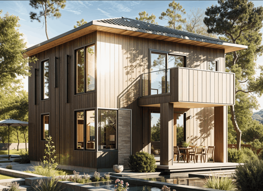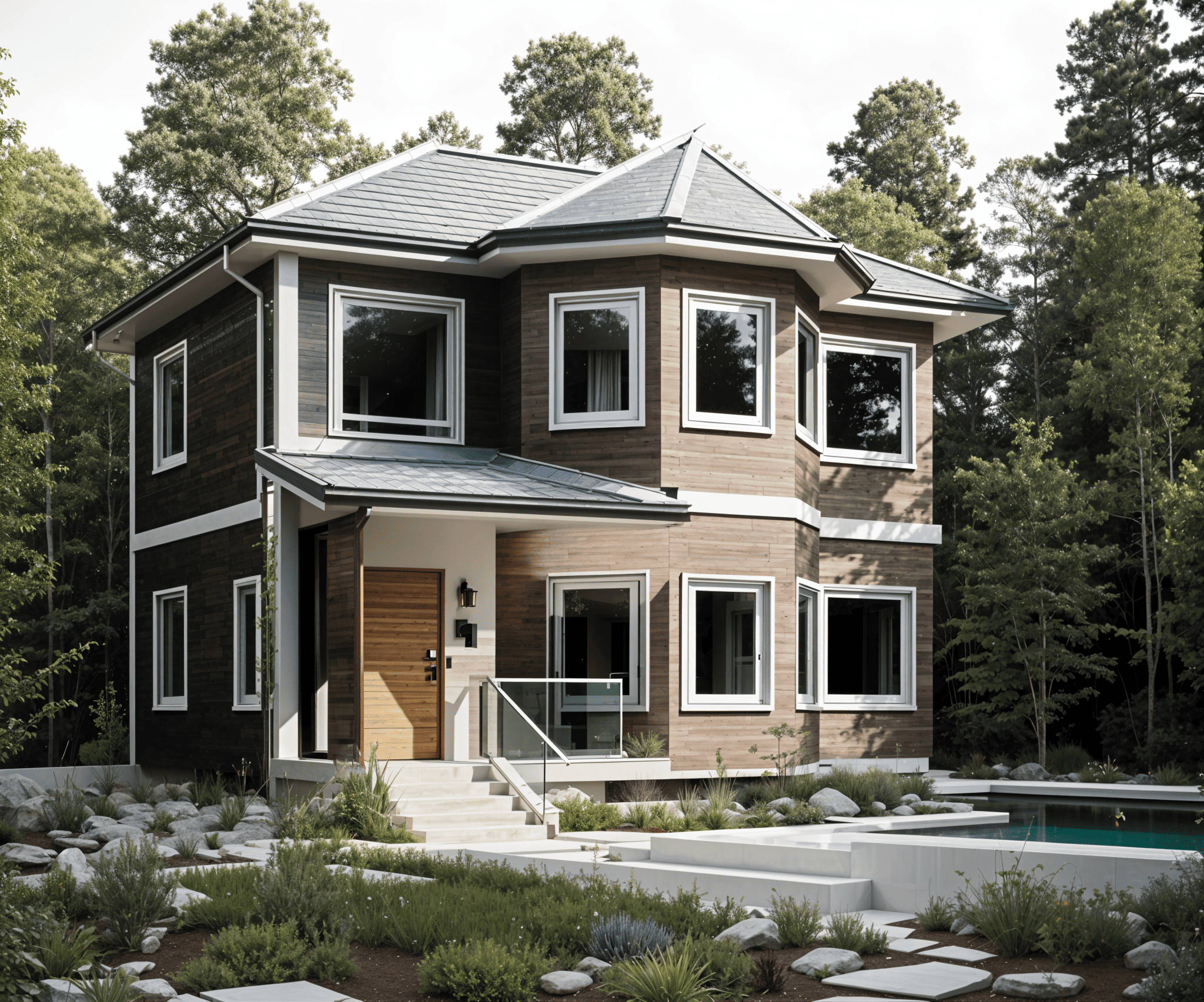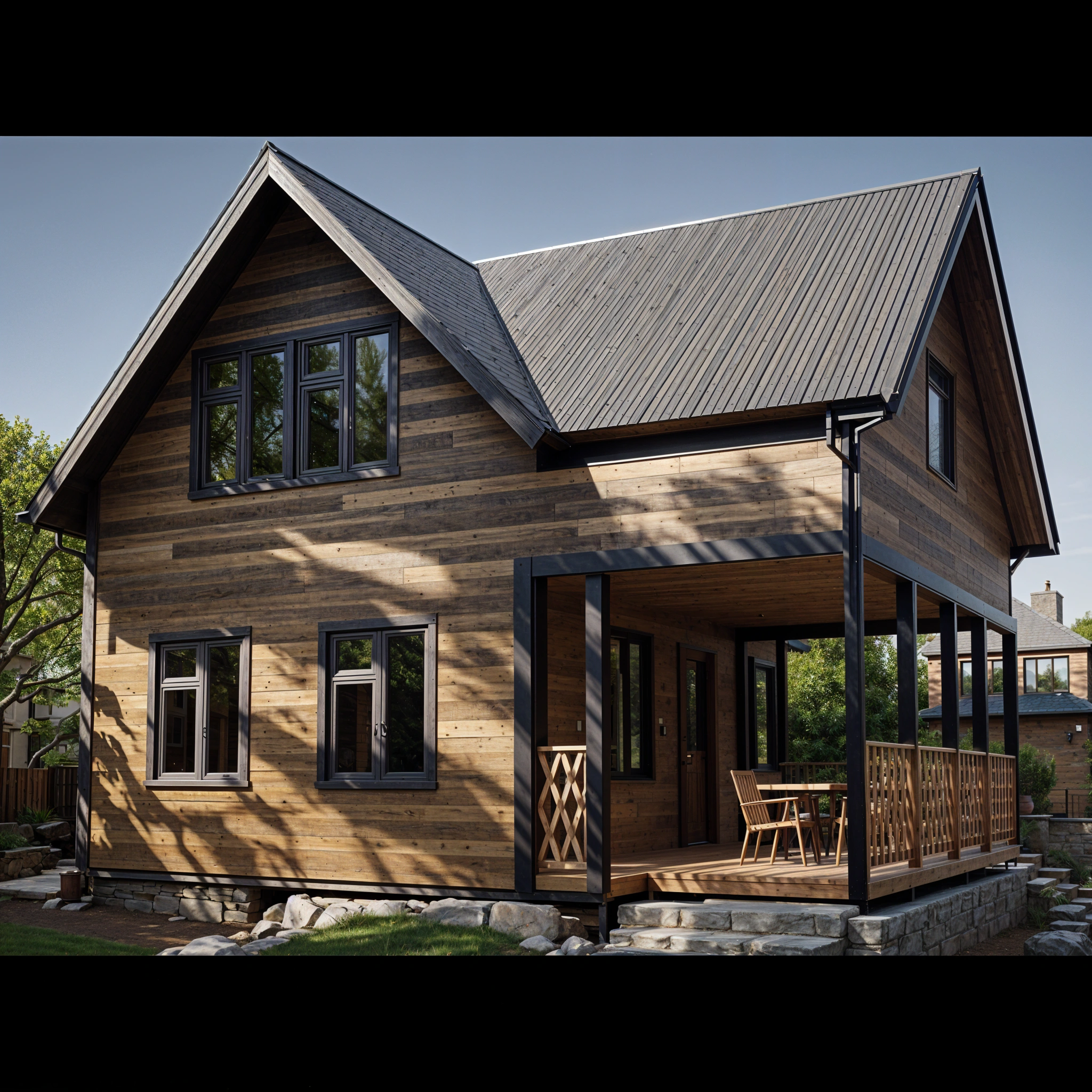 Для отделки используется натуральное дерево в сочетании с современными материалами. Фасад дома облицован сайдингом, имитирующим структуру дерева, что придает ему элегантный и стильный вид. Внутренняя отделка выполнена в скандинавском стиле с использованием светлых оттенков и натуральных материалов.