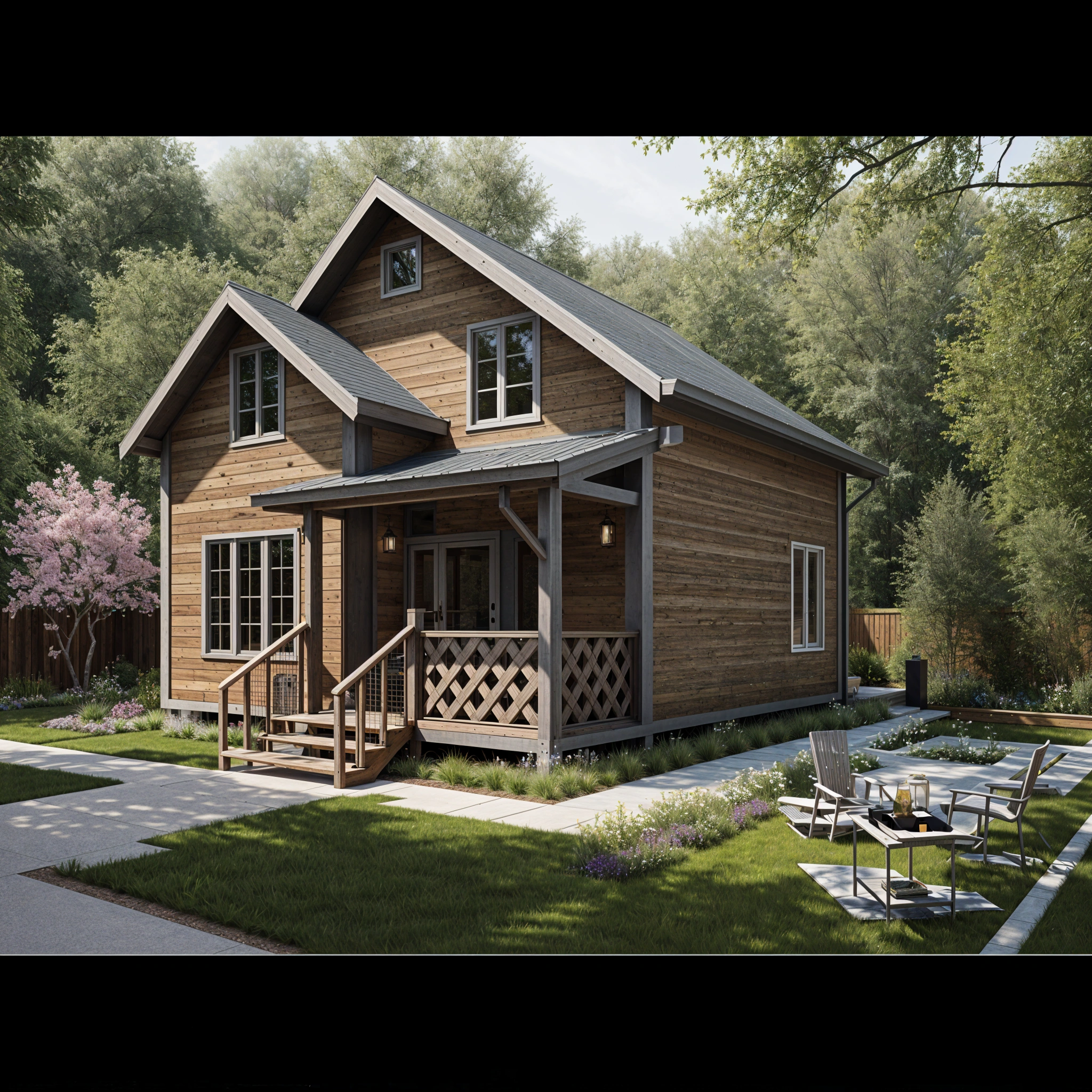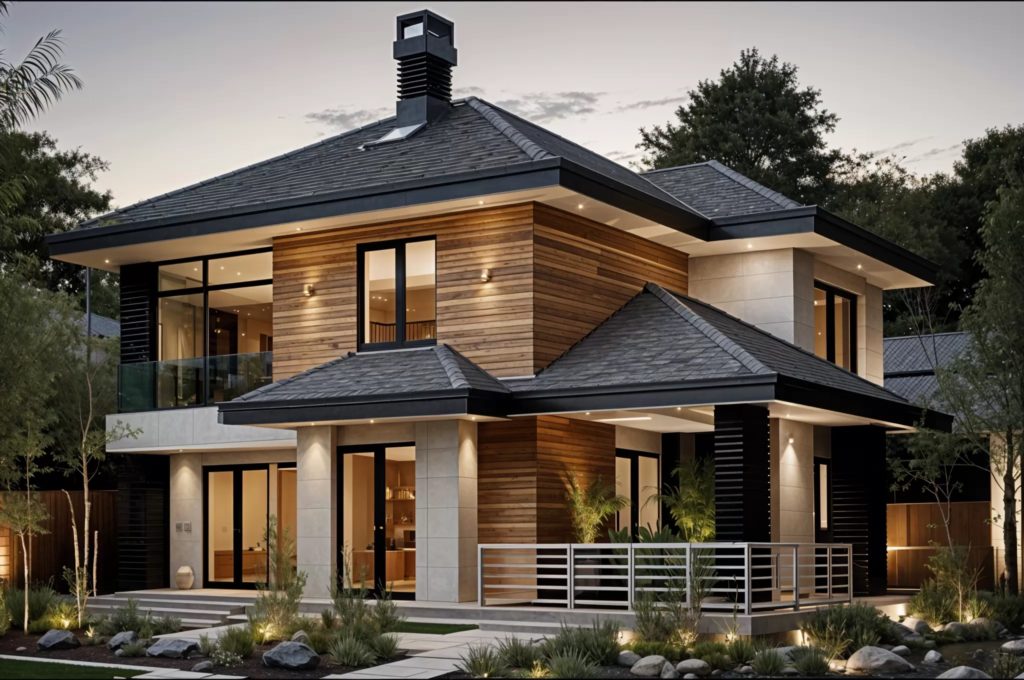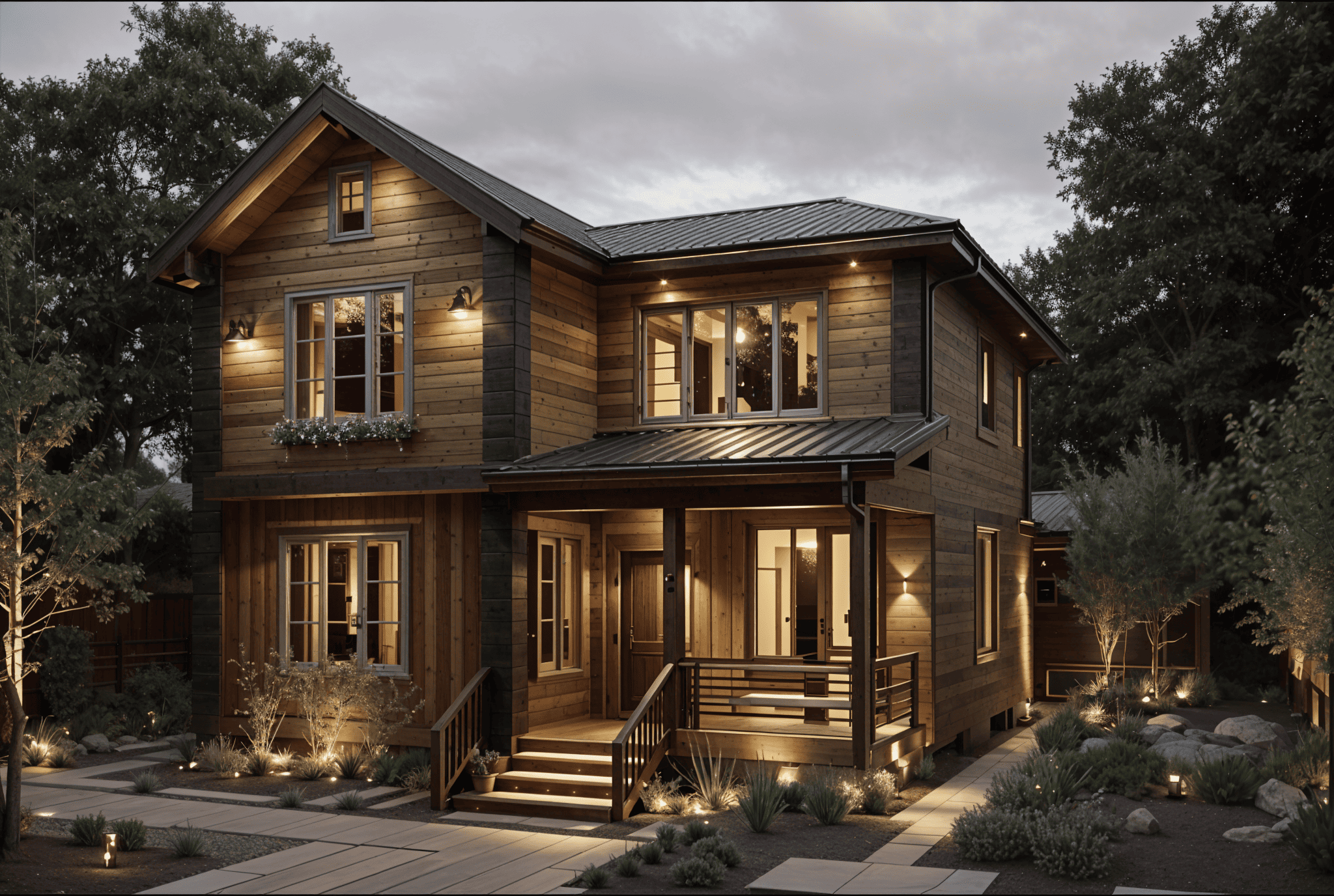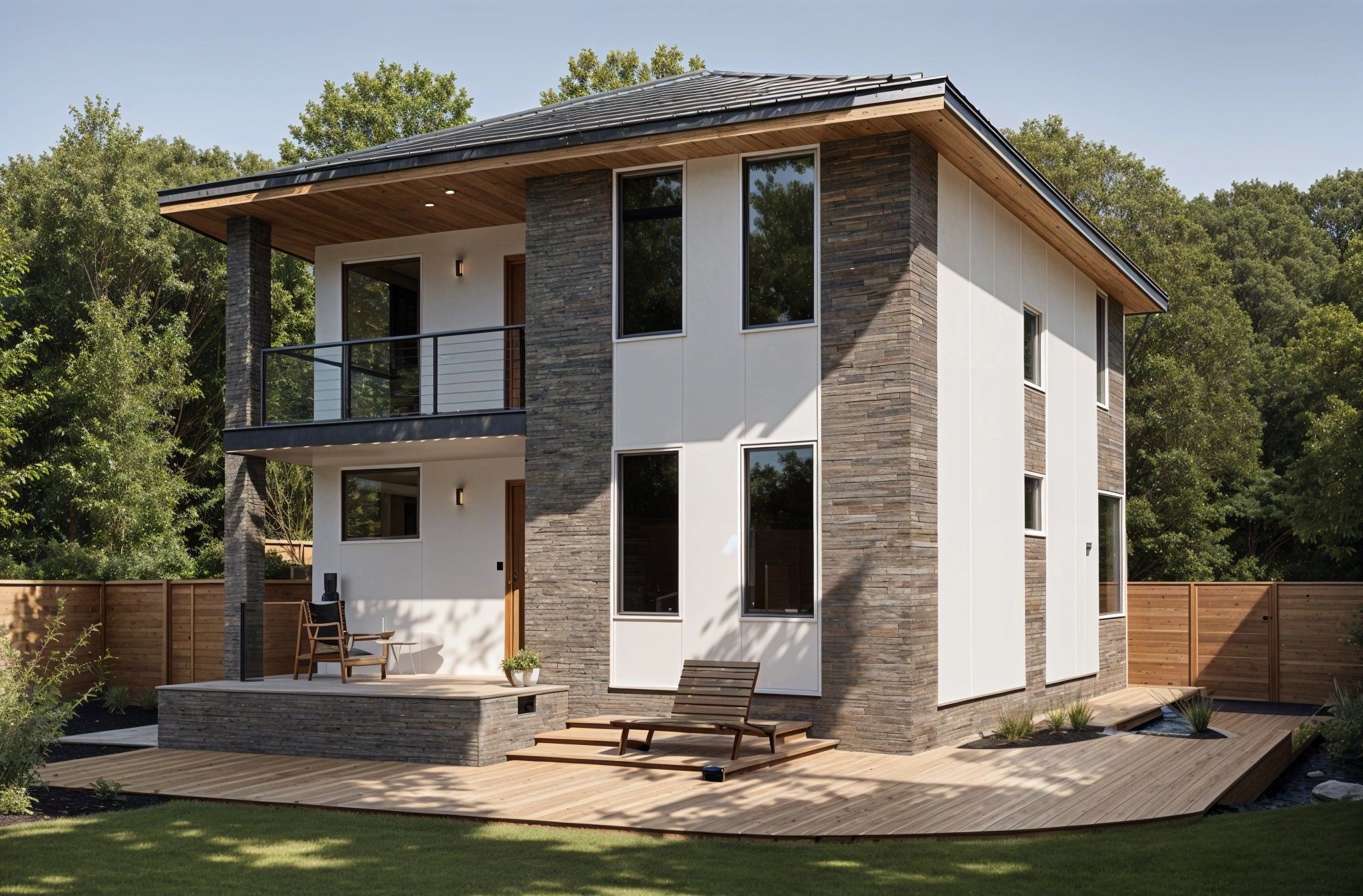 Для отделки используется натуральное дерево в сочетании с современными материалами. Фасад дома облицован сайдингом, имитирующим структуру дерева, что придает ему элегантный и стильный вид. Внутренняя отделка выполнена в скандинавском стиле с использованием светлых оттенков и натуральных материалов.
