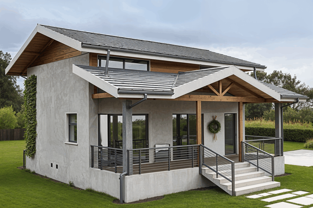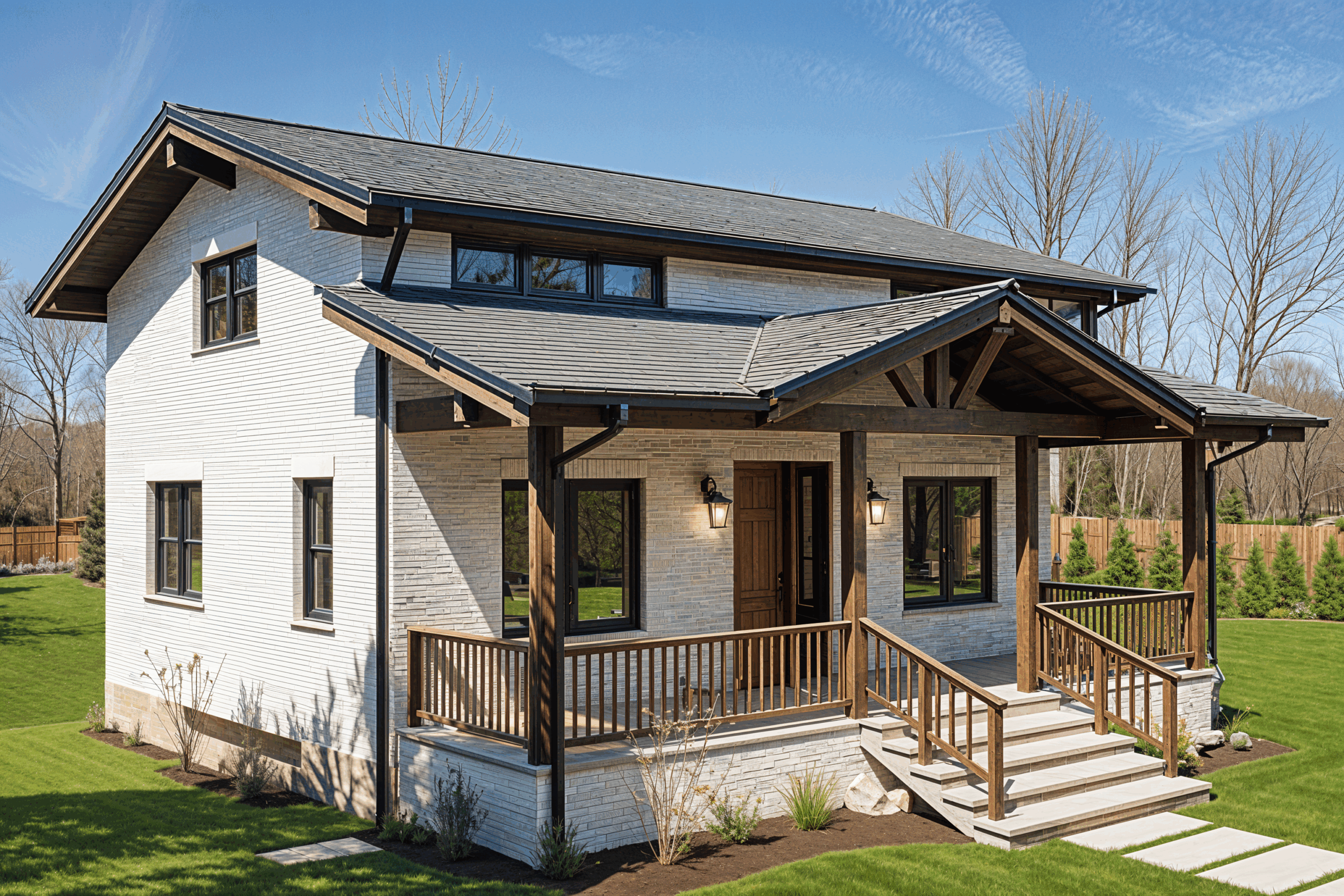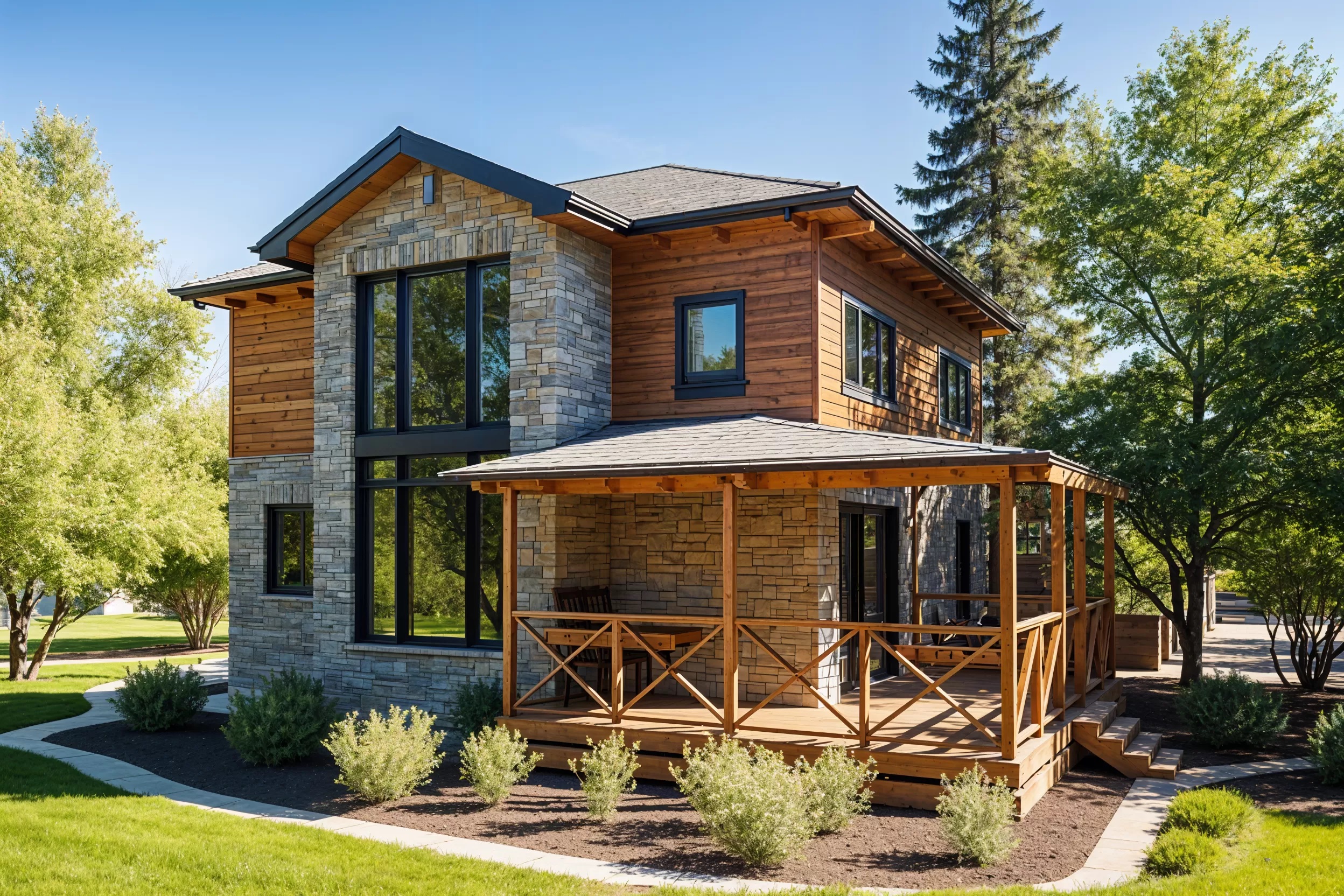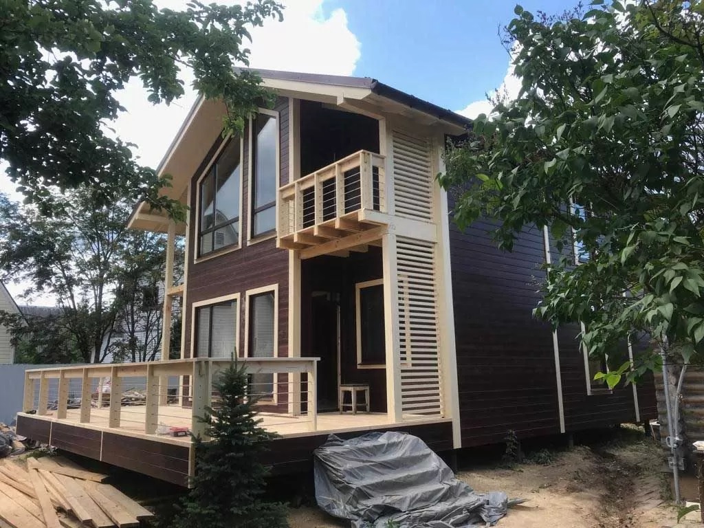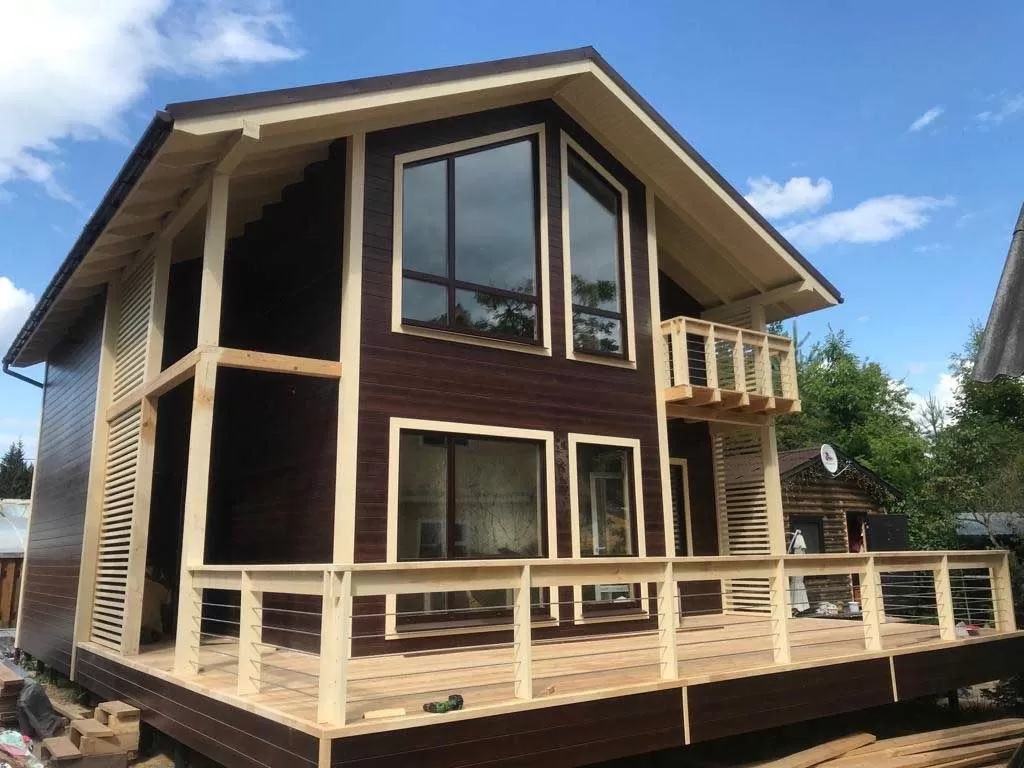 Ещё одно преимущество двух этажей в каркасном доме — это современный стиль. Чистые линии фасадов, большие окна и панорамное остекление делают дом визуально лёгким и открытым, а сочетание разных материалов отделки позволяет придать индивидуальность каждому проекту. При этом сохраняется высокий уровень теплоизоляции и энергоэффективности: качественный утеплитель и продуманная вентиляция создают комфортный микроклимат в любое время года, а окна и системы отопления позволяют экономить на коммунальных услугах.